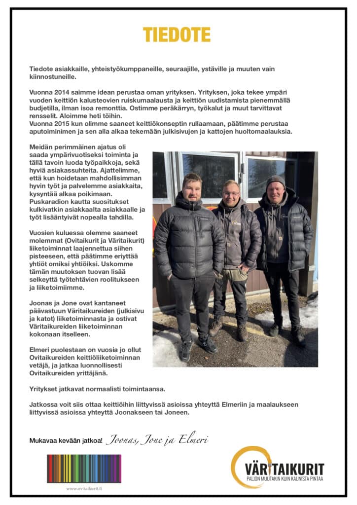 Väritaikurit on julkisivuihin ja kattoihin erikoistunut maalausyritys Uudellamaalla. Olemme maalanneet taloja ja kattoja jo vuodesta 2014 lähtien. Me olemme aina halunneet näyttää, mitä laadukkaalla työllä ja palveluilla voi saada aikaan. Annamme työlle poikkeuksellisen pitkän, 3 vuoden takuun.